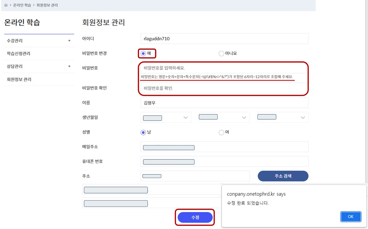 안녕하세요 원탑에이치알디입니다. 비밀번호 찾기 & 변경 방법입니다. ① 비밀번호 찾기 클릭 ② 아이디,이름,생년월일,휴대폰 번호 입력 후 비밀번호 찾기 클릭 하시면 신규 비밀번호가 SMS 발송됩니다. ③ SMS 발송된 임시 비밀번호를 입력하여 주세요 ④ 임시 비밀번호 로그인 후 회원정보 관리 클릭해주세요. ⑤ 회원정보 관리에서 비밀번호 변경 (예) 클릭 후 비밀번호를 변경 하시고 수정 버튼을 클릭하시면 수정 완료 되었습니다.라는 문구가 활성화 되면 정상적으로 변경이 됩니다. ( 비밀번호는 영문+숫자+문자+특수문자(~!@#$%)가 포함된 6자리~12자리로 조합해주세요 ) ![]() 감사합니다. |