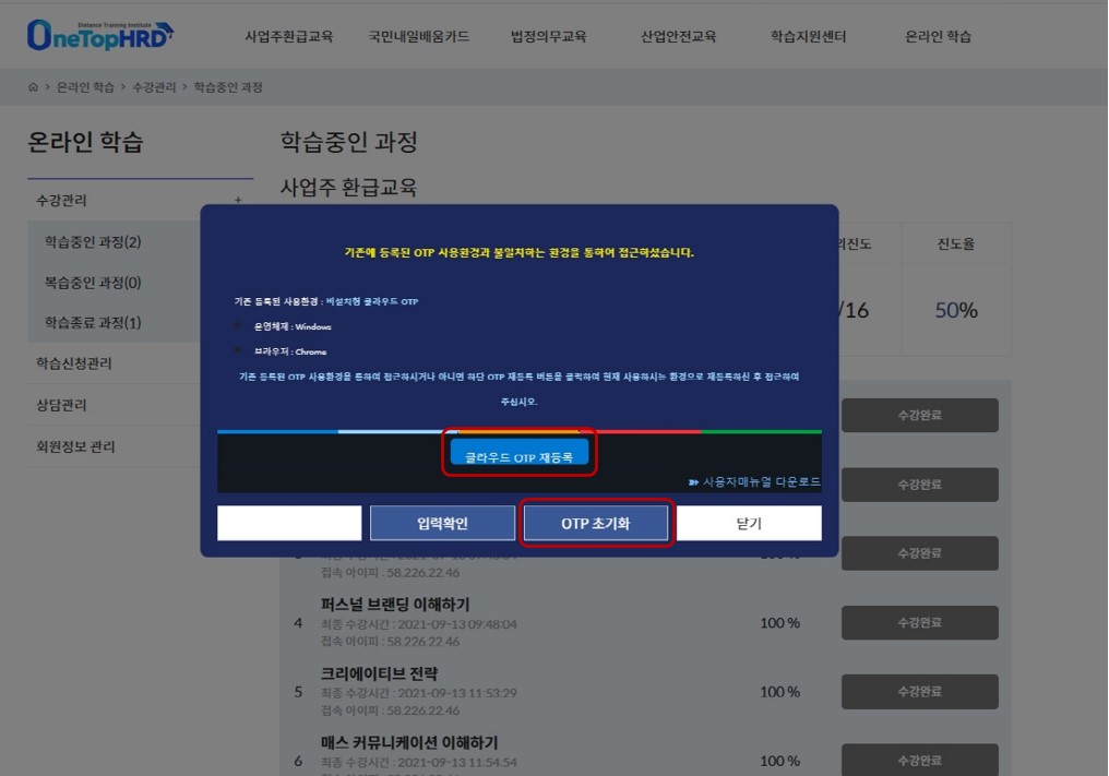 ③ OTP 등록 오류가 있을 경우 하단 OTP초기화 클릭 후 클라우드 OTP 재등록을 클릭해주세요