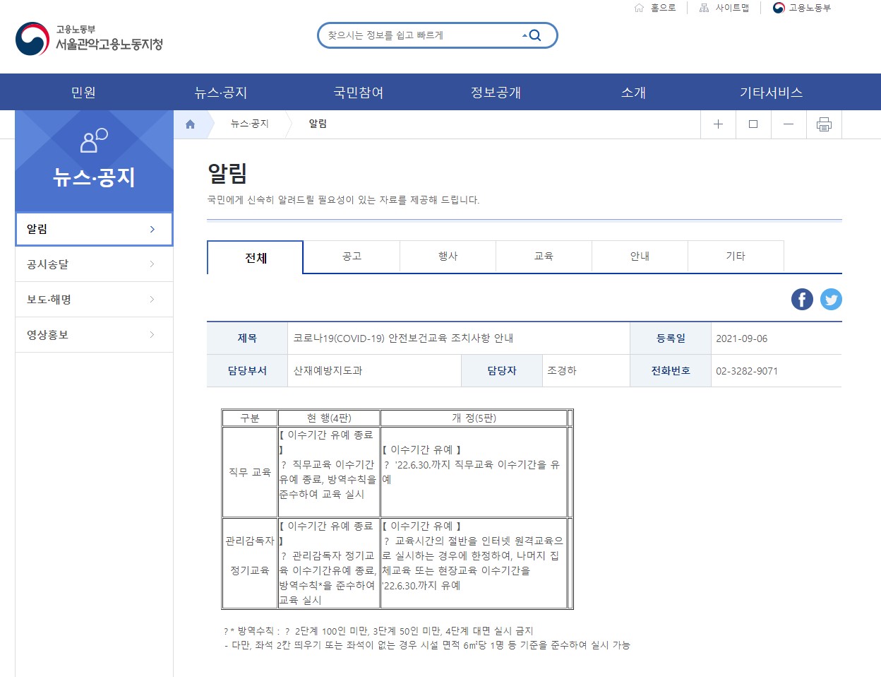 산재예방지도과, 코로나(COVID)-19) 안전보건교육 조치사항 안내